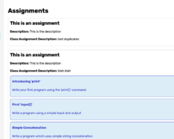 Parsons problems and an automatic support framework for students is now fully in place. Class, assignment and project management are nearly there. I’ve also been tweaking the appearance a little as well…but I will do more with that later.